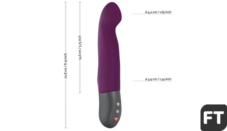The Stronic G is an average-sized toy. It measures 8.19″ from head to base, with an insertable length of 5.75″. Plus a diameter of 1.65″ at its widest part (that’s the head) and the rest of the shaft around 1.34″.